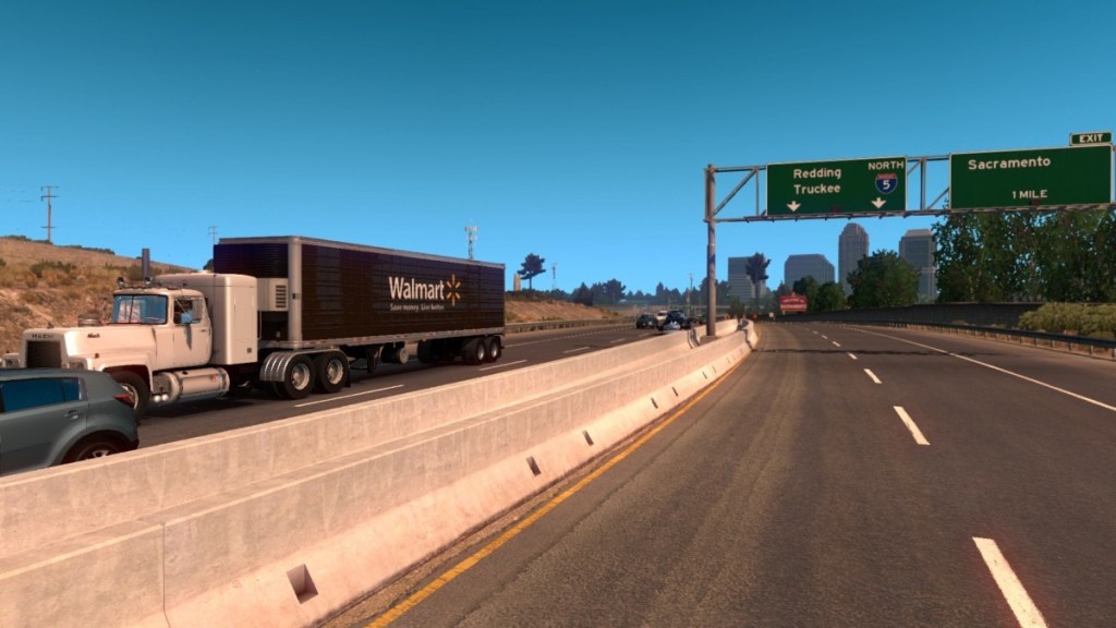 Zuerst ging es durch Sacramento auf dem Weg zur Interstate 5. Dabei merkte ich dann das Fehlen der modernen Hilfsmittel, wie Luftunterstützung der Kupplung und Servolenkung. Zum Glück brauchte ich bei dem Fuller Getriebe die Kupplung nur beim Anfahren. „Mit dem Gerät ist das noch Knochenarbeit. Du wirst dich schon bald nach einem modernen Truck sehnen.“ Meinte Joe mit einem Grinsen. „Jetzt weiß ich wenigstens, warum die Lenkräder früher so groß waren.“ „Einfache Hebelgesetze.“ Sagte Joe. „Fahr jetzt in Richtung Süden auf die I-5.“ Ich war beinahe schon zu schnell, um dort abzubiegen. Aber bei der Fahrt ließ es sich etwas einfacher lenken, als beim Rangieren. Nun ging es endlich auf den Freeway und dann aus Sacramento heraus.