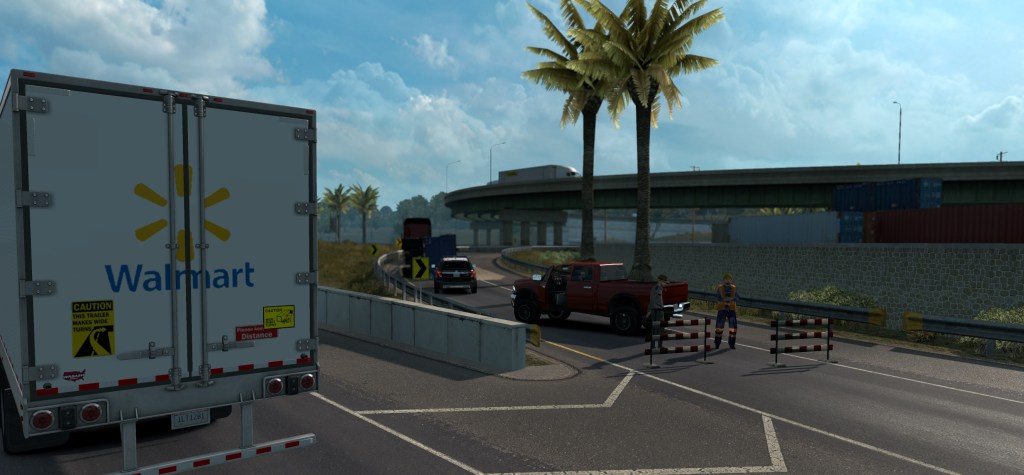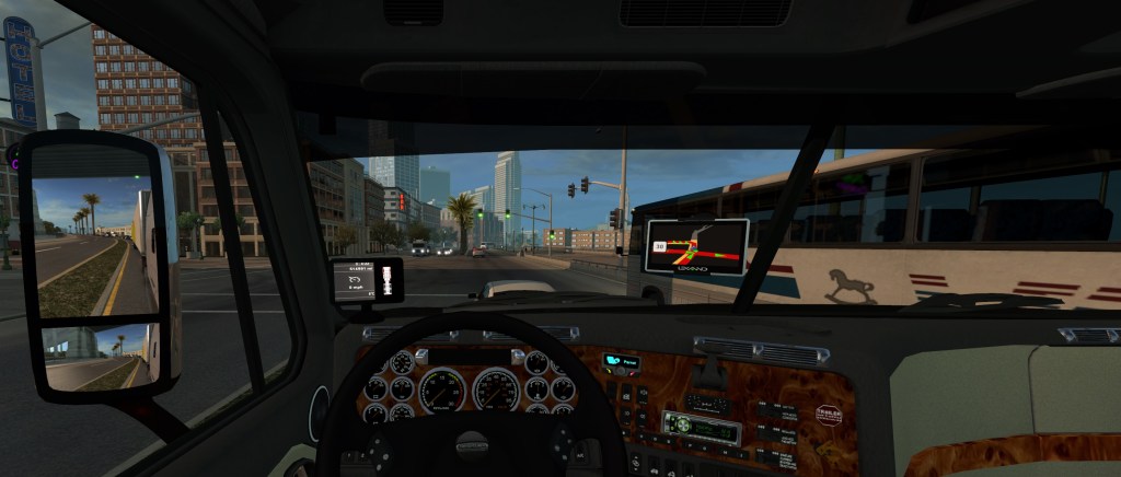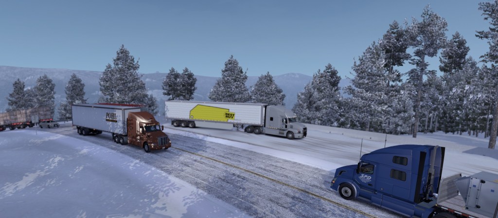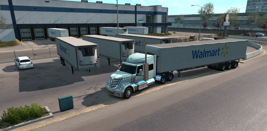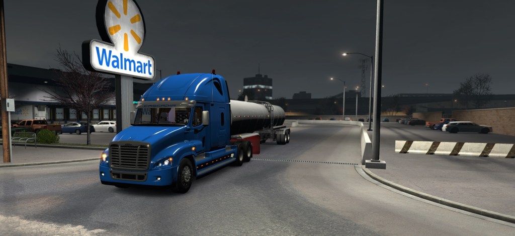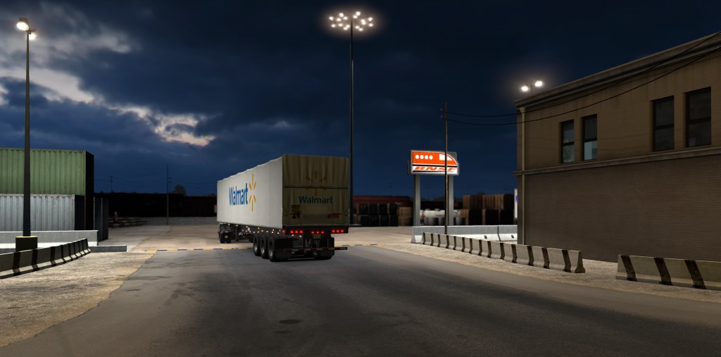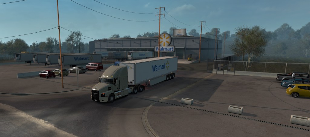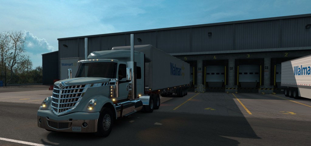 Als wir dort ankamen, stand Tony schon dort. Die Maschine, die auf uns wartete war ein Lonestar mit mittlerer Kabine, der in Himmelblau lackiert war. Bevor wir das Fahrzeug aber wechseln konnten, stand erstmal die Aufgabe an, den Trailer hinten in die Ecke zu rangieren. Natürlich waren davor alle Docks belegt. Hochkonzentriert schaffte ich es aber, den Trailer ohne Probleme in die Ecke zu rangieren.