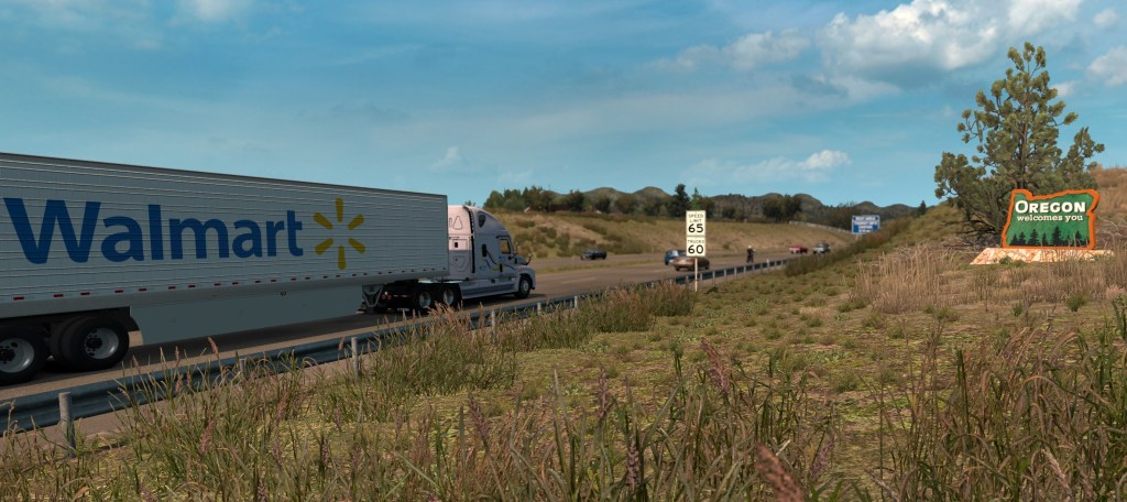 An der Cypress Avenue fuhr dann ein ganzes Stück vor mir ein Kollege mit einem alten Walmart Trailer auf die Interstate 5. Ich sprach ihn über CB-Funk an und wir quatschten dann eine ganze Weile zusammen. Er war ein Kurzstreckenfahrer, der für einen Subunternehmer aus Redding tätig war. Heute war er vom Zentrallager Redding auf dem Weg nach Medford, um dem dortigen Supercenter Tiefkühlware zu bringen. Wir wechselten auf einen ruhigen Kanal und quatschten weiter. In den nun folgenden Bergen merkte ich aber, dass der Peterbilt des Kollegen ein wenig schwächer war. Er hatte zwar auch 400 PS, aber anstatt des Cummins ISX15 hatte er einen Paccar MX11 unter der Haube. Weniger Hubraum hieß weniger Drehmoment und damit weniger Kraft. Obwohl die PS Zahl was anderes aussagte. So schaffte ich es in den Bergen nicht nur hinter ihn zu gelangen, sondern sogar ihn vernünftig zu überholen.