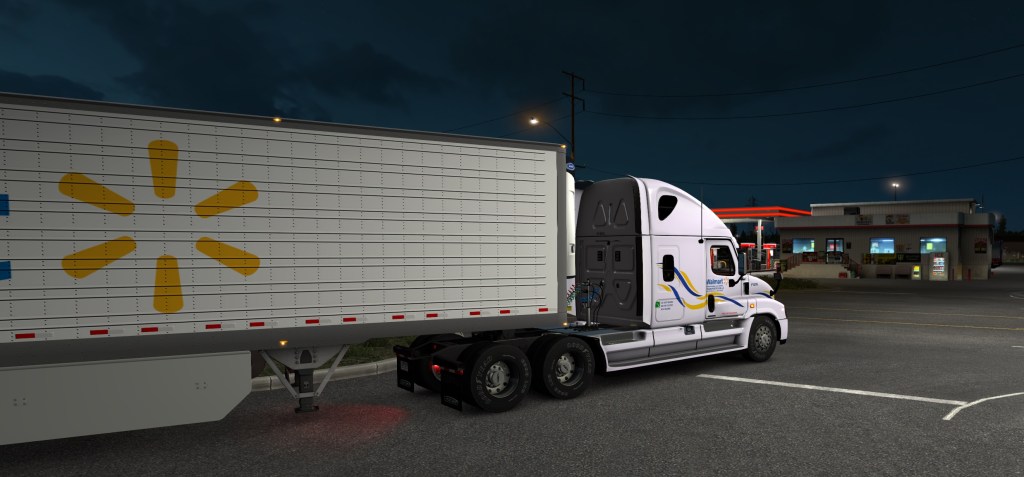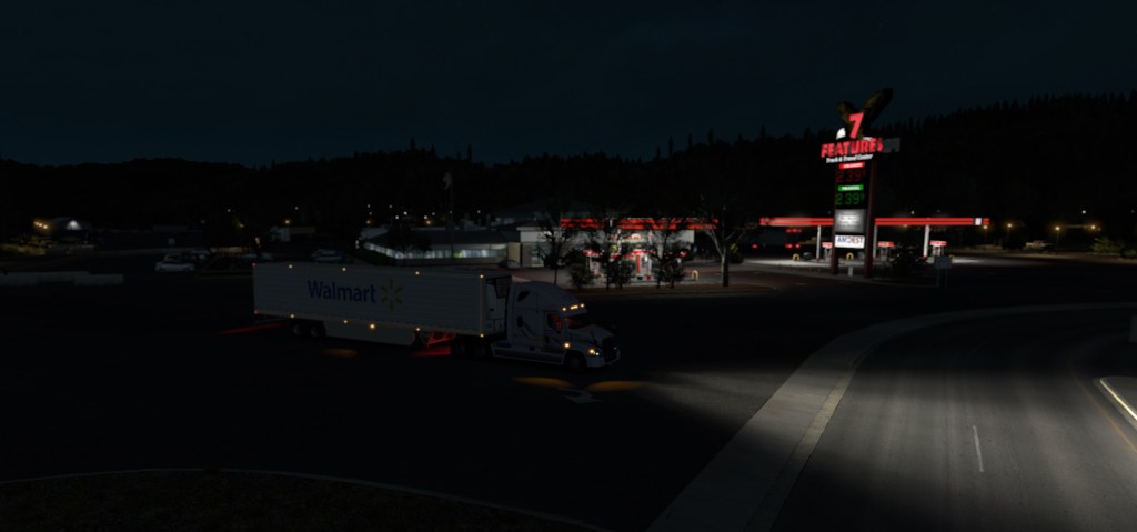 Nachdem die Tanks gefüllt waren, beschloss ich dann auch gleich hier meine Pause zu machen. Ich stellte den Cascadia an die Seite, so dass er keinem im Weg stand. Dann machte ich mich nochmal auf den Weg zum örtlichen Walmart Supercenter. Dazu musste ich dann einmal die US-20 und den Platz von Jack’s Truckstop überqueren. Mit meinen Einkäufen das ganze dann noch mal in umgekehrter Richtung. So hatte ich wenigstens noch etwas Bewegung.