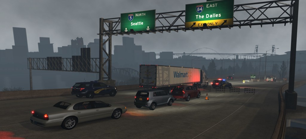 Mir blieb also nichts anderes übrig, als weiter der I-5 N zu folgen. Das Navi stellte sich um und gab mir vor, ein Stück weiter nördlich zu wenden und es dann von der anderen Seite zu versuchen. Als ich am Abzweig zur I-405 vorbei war, sah ich dann, dass ich das ebenfalls vergessen konnte. Von hier aus war die I-5 in Richtung Süden komplett gesperrt. Da ich auf der Gegenseite weder einen Unfall, noch eine Baustelle gesehen hatte, hing das vermutlich ebenfalls mit der Sperrung der I-84 E zusammen.