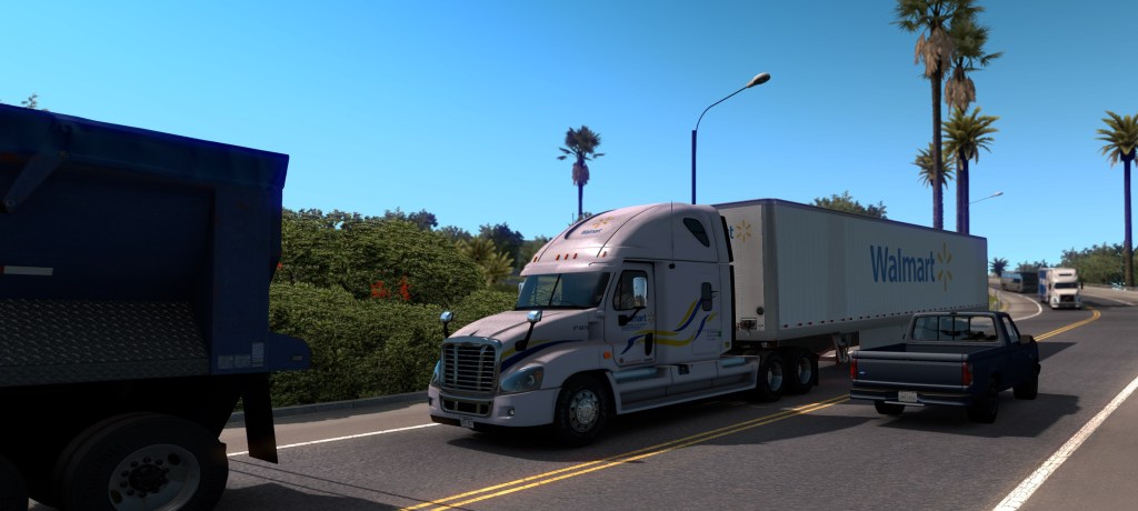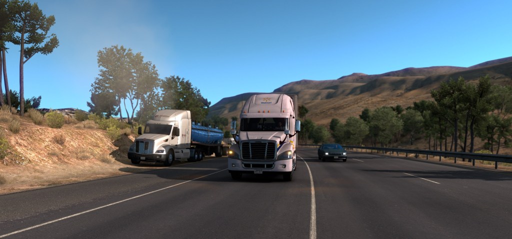 Es lief dann sogar so gut im Bereich Los Angeles, dass ich sogar noch aus dem San Fernando Valley wieder rauskam. Nun merkte ich, dass der Tejon Pass in nördlicher Richtung erheblich steiler war, als in der Gegenrichtung. Während ich auf dem Hinweg mit fast vollem Gewicht kaum unter 40 kam, ging es mit dem leichten Trailer nur mit 30 mph den Pass hinauf. Immerhin wurde es dem Cascadia nicht so warm, wie dem Peterbilt, der am Straßenrand stand.