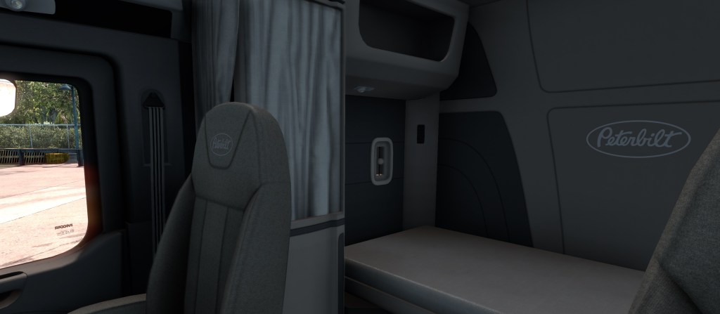 Lange Zeit war das die größte Version des 579 bis man mit dem 80 Inch Ultra Loft Sleeper eine richtig geräumige Version nachlegte, um konkurrenzfähig zu bleiben. Letztere war mir aber nicht vergönnt. Die Maschine war neutralweiß, Stoßstange und Seitenverkleidung waren aber in grauem Plastik gehalten. Nichts Besonderes, aber zweckmäßig. Der Verkäufer gab mir die Schlüssel und ich stieg ein, während er und Dad den äußeren Zustand dokumentierten. Ich loggte mich in dem frisch eingebauten Tablet in ORBCOMM und E-Log ein und stellte die Systeme auf PTI. Dann schaute ich mich im Inneren des Peterbilt um.