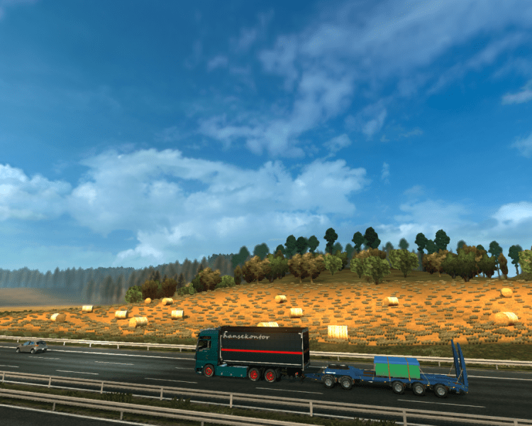 Die Fähre erreicht pünktlich den Rostocker Hafen. Ich rolle zur Autobahn. Mir kommt lichthupend ein Scania mit Containerchassis entgegen. Donald. Der CB-Funk schnarrt. „Moin Wiebke.“ „Moin Donald. Aber hier ist Christian.“ „Hä? Das war doch eben Wiebke’s MAN???“ „Schon richtig. Ich fahr den für ne Tour nach Spanien. Wie schauts unterwegs aus?“ „Aha. Warum auch nicht. Ich komme gerade aus Wismar. Da war alles frei. In Lübeck müsste immer noch die Baustelle von der A20 zur A1 sein. Bin ich die letzten Tage aber immer recht gut durchgekommen.“ „OK. Dann schauen wir mal.“ Auf der A20 ist wenig los. Ich fahre an Feldern mit aufgerollten Heuballen vorbei.