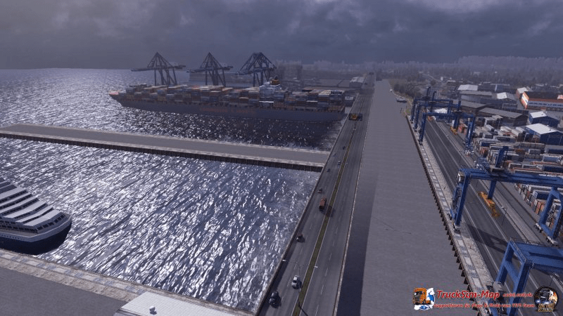 Nachdem ich die Stadt mehr oder weniger umrundet hatte, kam der Hafen in Sicht. Mehrere Fähren sowie ein großes Containerschiff lagen dort vor Anker.