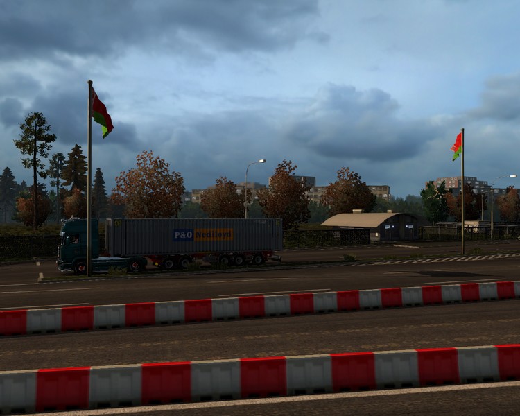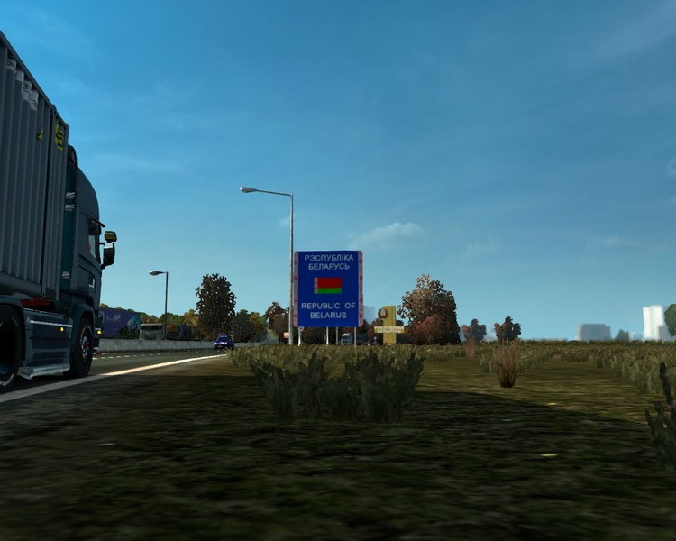 Zurück am V8 mache ich meine Abfahrtskontrolle und rolle dann Punkt 10:00 Uhr am Schlagbaum vorbei. Zwei Kilometer später werde ich noch einmal am weißrussischen Zoll ausgebremst. Dort wirft man aber nur einen Blick auf den Container. Verplombt. Ich darf weiterfahren. Ich beschleunige auf 85km/h und stelle den Tempomaten dann auf diese Geschwindigkeit. E30 immer gen Westen, der Beschilderung erst in Richtung Minsk und später dann in Richtung Brest folgend.