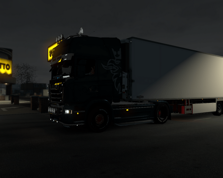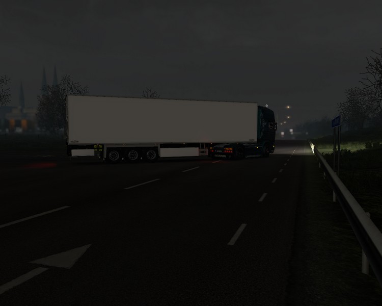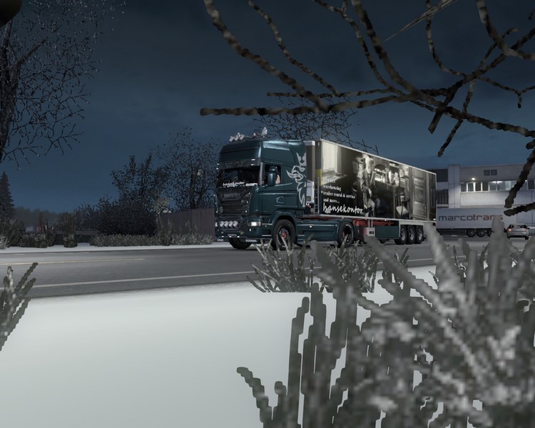 Kurz vor 22:00 Uhr starte ich den V8 und beginne mit der Abfahrtskontolle. Die Temperaturen sind ganz schön in den Keller gegangen und die Umgebung glitzert leicht überfroren. Ich schließe Dannys Halle ab und klettere ins Fahrerhaus. Dann geht es aus dem Gewerbegebiet heraus zur E6, auf die ich in Richtung Süden auffahre.