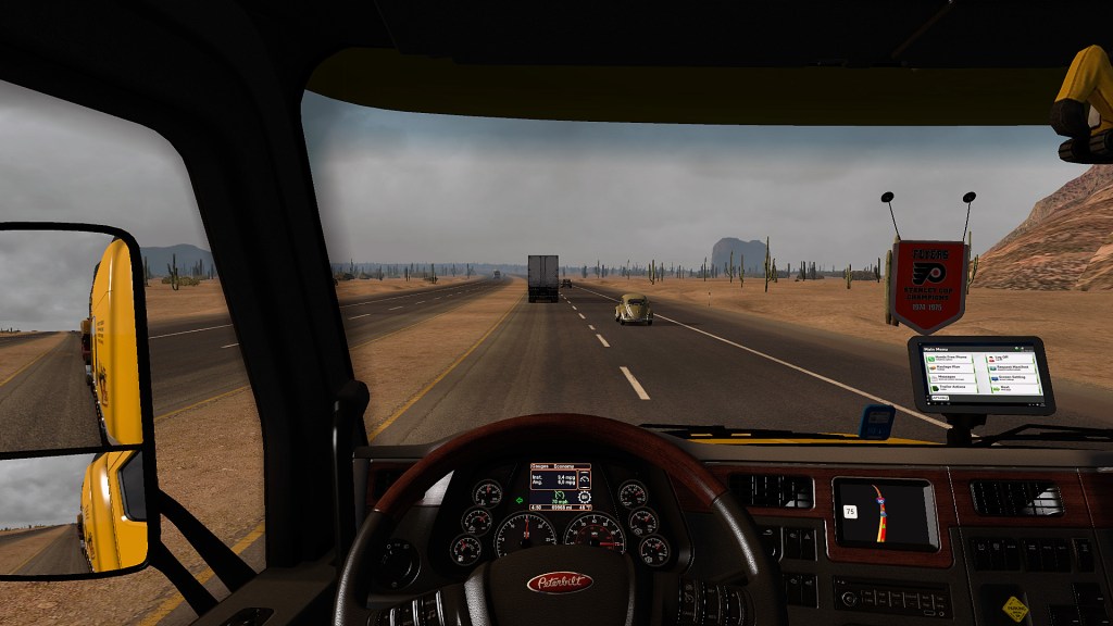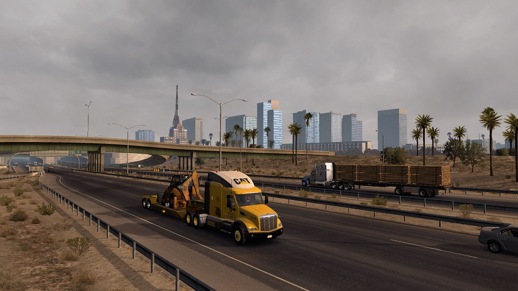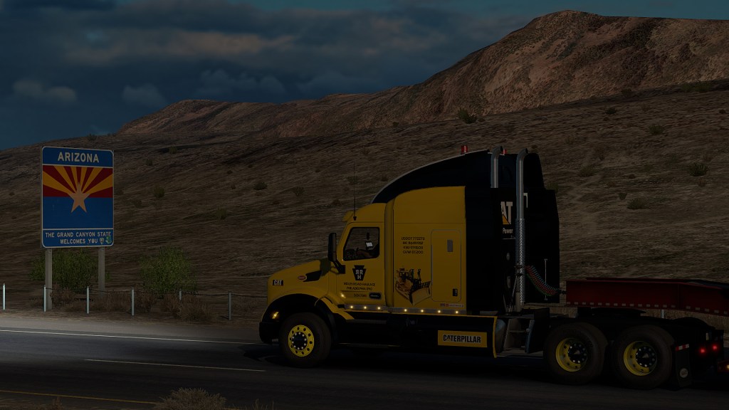 Die üblichen anderthalb Stunden nach Baltimore waren keine Sache, dort war ein Lagerplatz mit Baumaschinen von CAT. Als ich ankam, lief der einzige Ansprechpartner gerade zu einem Kenworth W900 mit einer Planierraupe auf dem Trailer. Er sagte mir, ich sollte auf Pause stellen, so lange er noch die andere Übergabe fertig machte.
