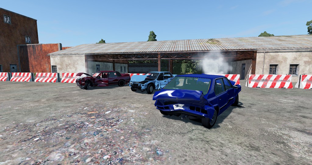 Die anderen zwei hielten an. Weil er die Tür nicht auf bekam, setzte er sich quer auf die Vordersitze und trat einmal dagegen, worauf sie doch aufsprang. Dann stieg er aus und ging hinter die Betonblöcke, die wohl eigentlich den Arbeitsbereich vom Kundenbereich trennten. Die anderen beiden machten noch weiter, bis auch Mick im Mazda aufgab. Er hatte versucht auszuweichen und dabei einen richtig bösen Treffer in die Fahrertür bekommen, allerdings im flachen Winkel, so dass sie wohl nicht ins Auto reingedrückt wurde. Sie wurde aber aus einem Scharnier gerissen und so heftig verbogen, dass man sie nicht mehr schließen konnte, weshalb Nico mit dem BMW gewonnen hätte. Da er aber zweimal Fahrertüren getroffen hatte, wurde er disqualifiziert und Mick zum Sieger erklärt.