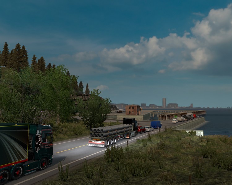 Bei Grums muss ich meinen Zug verlangsamen, da der Verkehr vor einem Kreisverkehr abbremst. Dort trifft die E45 auf die E18. Es geht gen Südwesten vorbei an Slottsbron, dann trennen sich die beiden Europastraßen und ich folge der Beschilderung mit der E18.