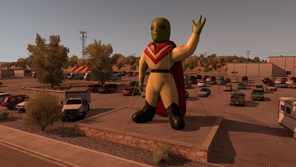 Leider war die Stadt nicht auf Trucker im Reset eingestellt. Ich sah mir die Alternativen kurz durch. Eine 66 Tankstelle an der South Main Street mit Stripes Krämerladen daneben, dafür ohne Dusche. Ob die Tankstelle von Allsup’s mit ein paar Stellplätzen an der Ecke East College / North Garden eine Dusche hatte, ließ sich nicht herausfinden. Schade eigentlich, denn der kleine Laden sollte gut für die Grundversorgung sein und es gab eine Menge Kettenrestaurants in lauf- oder skatebarer Entfernung. Und dann gab es noch das Chisum Travel Center. Es hatte Duschen. Punkt. Der Platz könnte bei den in dieser Stadt immer reichlich vorhandenen Verschwörungstheoretikern als Drehort der gefaketen Mondlandung durchgehen, das Essen und der Shop waren wohl eher so lala.