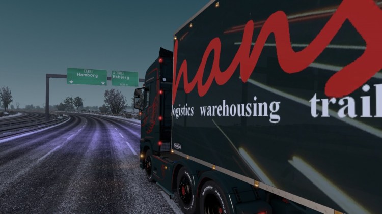 Seitenverkleidungen. Die Beschriftung macht ihr mir drauf?” ”Na gut. Und klaro… wenn du den Trailer abholst kann der Volvo auch gleich mit gemacht werden. Die Dateien für die Folien haben wir ja noch da.”