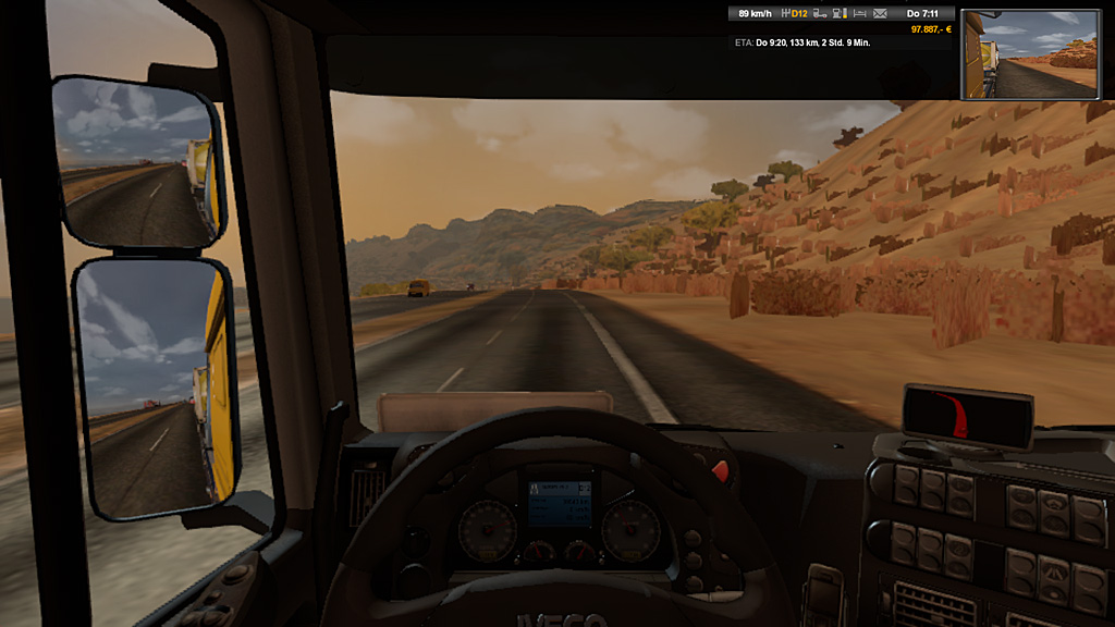 Nach einer kurzen Nacht war ich schon früh und noch in der Dunkelheit wieder unterwegs. Es gab hier kein Tempolimit für LKW, also fuhr ich Vollgas und nahm bergab mit, was ich kriegen konnte. Mein Rekord war, dass ich bei mehr Helligkeit draußen mit 132 km/h durch eine Senke flog. Mehr gab der Antriebsstrang nicht her, der Motor bremste auch im Schiebebetrieb und ohne aktivierte Motorbremse irgendwann Aus dem Alter, in Neutral zu gehen, war ich schon lange raus.