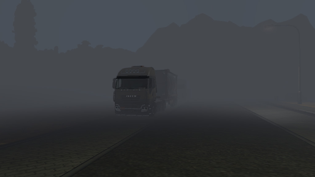 Am nächsten Morgen hatte sich das Bild leider etwas gewandelt. Meinen eigenen Truck konnte man noch erkennen, der Volvo hinter mir war ebenso verschwunden wie die Tankstelle und die Sonne, die noch tief hinter den Bergen steckte, zeichnete diese als dunkelgrauen Umriss in den hellgrauen Himmel.