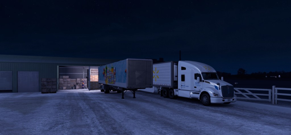 Danny missbrauchte mich also als City Trucker. Die Ladung war aber dringend, also akzeptierte ich das so. Ich fuhr zu Tor 11 und setzte den Trailer ans Dock. Nun hieß es auf die Beladung warten. Diese begann aber wirklich nach fünf Minuten.