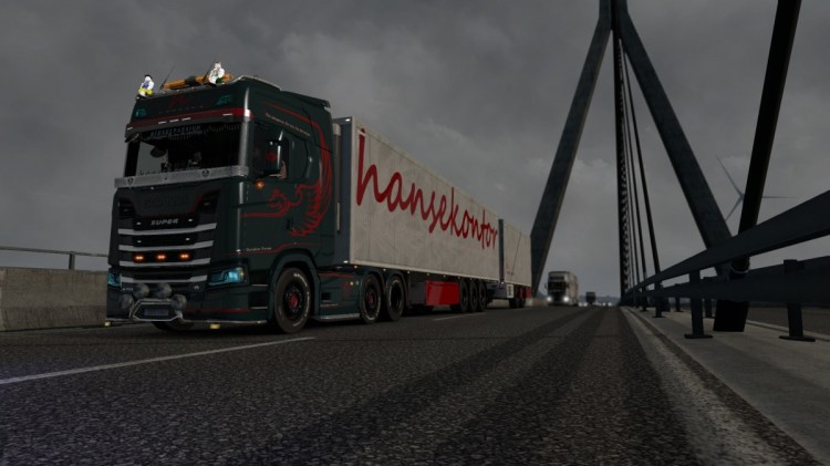 Etwas über drei Stunden später geht es für mich dann wieder weiter. Auf zum Kunden im Rostocker Süden. Mir kommt ein Scania R500 Highline in meiner Firmenfarbe entgegen und nur Sekunden später meldet sich das Funkgerät: „Ohauerha… Chef gesichtet.“ „Hej Yvonne. Na klaro. Ich muss doch gucken ob ihr die Container schubst.“ „Tun wir. Donald wirst du dabei aber nicht sehen. Er ist vorhin los Richtung Berlin.“ „Immer unterwegs. Das ist gut. Wie schauts bei dir, Yvonne?“ „Ich stell meine Büchse jetzt gleich in den Hafen. Direkt wieder eine drauf. Die muss aber nur bis nach Bentwisch. Danach bin ich durch für heute. Bei dir so?“ „Ich hab Speiseeis drauf. Das geht noch in Rostock von Bord.“ „Einmal Amarenakirsch, bitte…“ „Is klar…. Kannste dir in Hamburch abholen.“ „Da geht’s mit dem nächsten Krempel hin?“ „Keine Ahnung. Das sagt mir Mona nachher noch. Auf jeden Fall muss ich bis Freitagnachmittag in Hamburg sein, da ich Samstag dort ne Regatta paddel.“ „Nunja, wird schon. Viel Spaß und Erfolg. Ich nehme mal an dass du Langstrecke paddelst?!“ „So isses.“