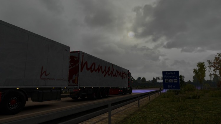 Es ist 16:15 Uhr als ich mit fünfzehn Tonnen Fisch im Sattelauflieger wieder starte. Musik an und los. Der angehängte Tandem der B-Double-Kombination ist leer und fährt als Deko mit nach Hamburg. Da sich der Tankinhalt vom rovfågel dem Ende zuneigt fahre ich schon fünfundvierzig Minuten später am Fuchsberg wieder von der A20 ab.
