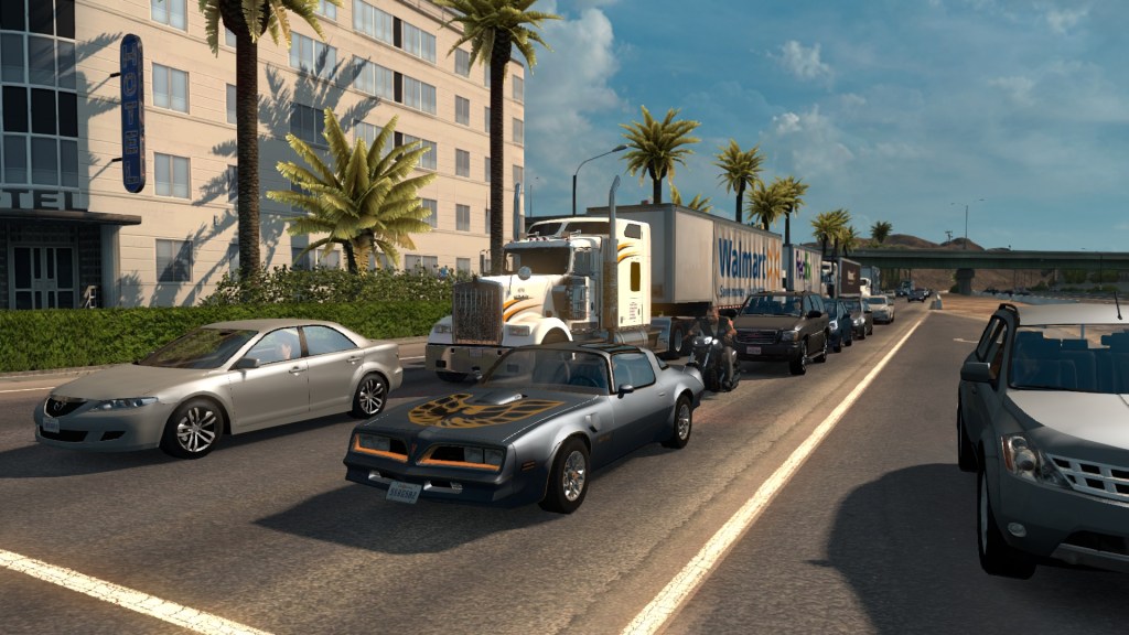 An einer leichten Steigung lief ich auf einen Subunternehmer von Walmart Fresno auf, den ich vom Sehen kannte. Ich überholte ihn und machte mich kurz mit dem Lufthorn bemerkbar. Dann unterhielten wir uns eine ganze Zeit über Funk. Das war auch noch so, als wir nach Bakersfield kamen. Bei der Fahrt durch die Stadt hielten uns mal wieder die zahlreichen Ampeln auf. Dabei konnte ich ein paar bewundernde Blicke auf einen 40 Jahre alten Trans Am werfen, der von seinem Besitzer ausgefahren wurde. Das wäre auch noch ein Auto, was ich mir für mich vorstellen könnte.