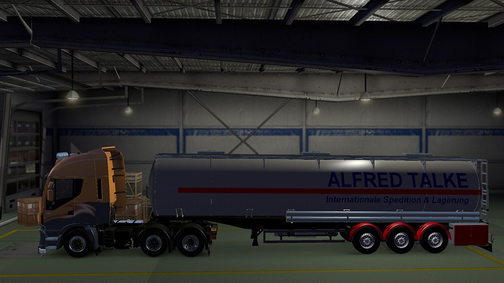 An der Haustankstelle tankte ich Samstagmorgen den LKW voll, viel war nicht mehr drin gewesen. Danach parkte die Fuhre in der Halle. Ein Anblick, an den man sich gewöhnen könnte. Wie gewünscht war die Bahn mit Toren auf beiden Seiten für mich frei. Ich kletterte auf den Einstieg von Ilarions Truck, um ein Foto von erhöhtem Standpunkt zu machen.