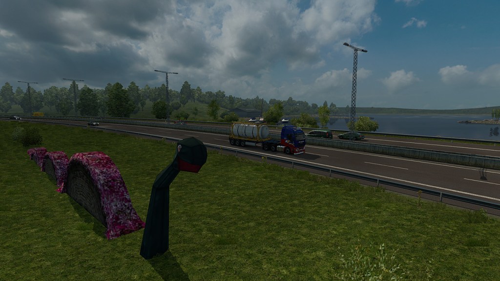 Und dann kam ich aus dem Wald, der auch so in der Lüneburger Heide, Brandenburg oder Ostpolen hätte stehen können und nichts Besonderes war. Am Ungeheuer vom Vätternsee, eine an das Ungeheuer von Loch Ness angelehnte Holzfigur mit Blumentrögen auf dem Rücken, schlug dann aber die Stimmung um.