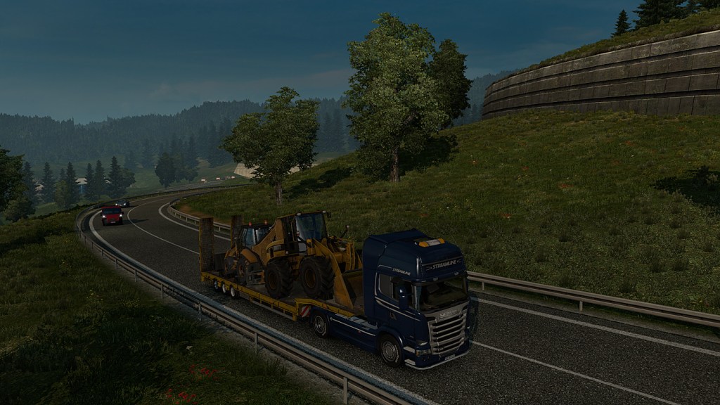 Das klappte auch problemlos und während andere Leute noch frühstückten, schraubte ich mich mit der neuen Ladung den Bayrischen Wald rauf. Es war mal keine Chemiefracht, sondern zwei Baumaschinen.
