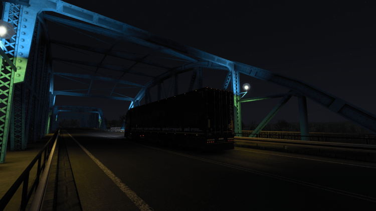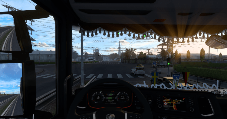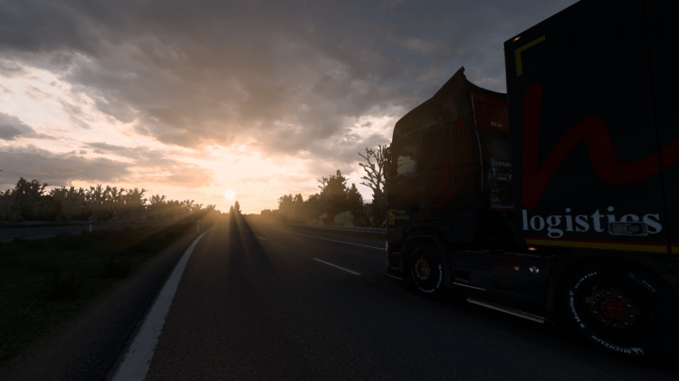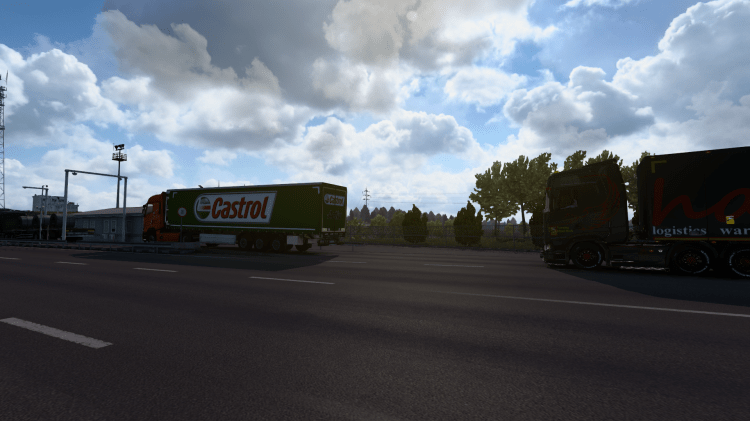 Als ich den Waagenbereich wieder verlassen will muss ich über eine Schwelle fahren die als Hindernis installiert ist um die Durchfahrtsgeschwindigkeit zu senken. Ich rolle langsam drüber. Als ich mit dem Palettenkasten des Aufliegers auf der Schwelle bin ertönt ein hässliches quietschendes Geräusch. Sch***. Ich bin mit dem Palettenkasten hängen geblieben. Ich schaue in den Rückspiegel und entscheide mich dann dafür etwas zurückzusetzen. Anschließend hebe ich meine Antriebsachse mittels der Luftbälge so das ich mehr Platz unter dem Palettenkasten bekomme. Ein neuer Versuch mit etwas schräge drüber fahren gelingt dann ohne erneutes Aufsetzen. Ich bringe die Antriebsachse wieder auf Fahrniveau.