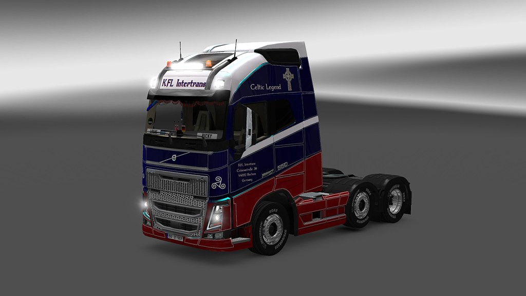 Außerdem hatte Ricky daraufhin noch entschieden, dass diese Trucks dann in gewissen Grenzen aus dem Corporate Design fallen dürfen. Dank Lukes Abstammung und Rickys Liebe zu Wales bekam die Zugmaschine konsequent britischen Style mit Konturlinien, zusätzliches Artwork in Form eines Keltenkreuzes und anstatt einem für das britische Design typischen und an den Ivecos erkennbaren Stern wurde die Front-Ecke mit einer keltischen Triskele dekoriert. Außerdem bekam er, ebenfalls typisch für britische Showtrucks, mit „Celtic Legend“ einen auf das Artwork bezogenen Namen.