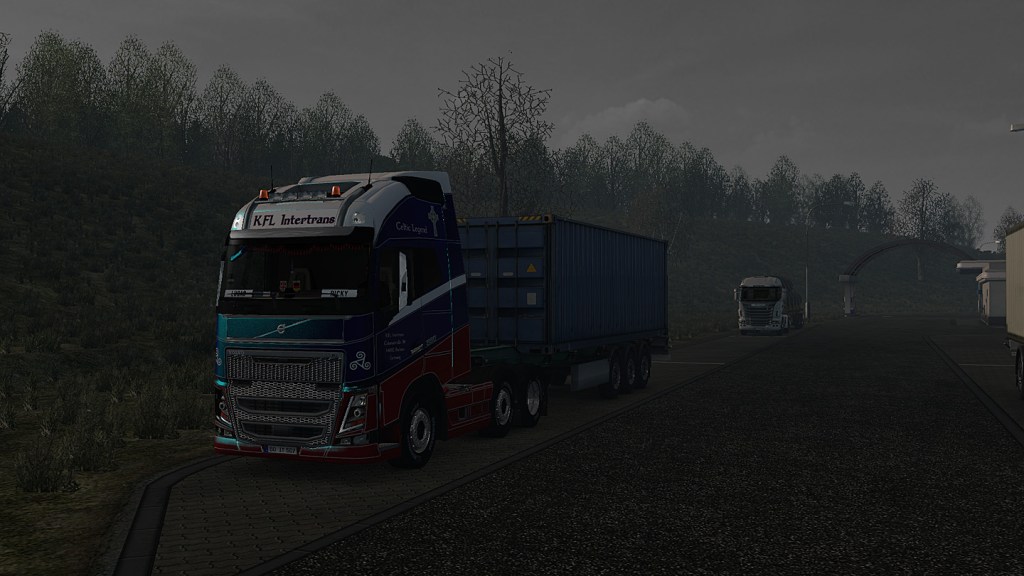 Nach dem Schnitt sah man die Frontscheibenkamera. „Mal sehen, wie lange das heute dauert, ich stecke hier ganz schön weit hinten.“ Irgendwann nach ein paar Einblendungen, wie viele Minuten vergangen waren, zur Wartemusik von Jeopardy bewegte sich was. Allerdings nur Stückchenweise, was er überschnell abspielte und nun mit dem im Midimapper entstandenen Retro-Lied „Play me like that Video Game“ vertonte. Als er aus dem Schiff auf die Rampe fuhr, rollte unten ein Sattelzug zum Zoll. Schwarz, Scania, rote Schrift, Patrick Schütz Thermotransporte. Wer sich drauf verließ, was der ankündigte, war auch verlassen. Jetzt fuhr der doch wieder Insel? Der änderte seine Richtung ja häufiger als Mutters Nähmaschine im Zickzackstich!