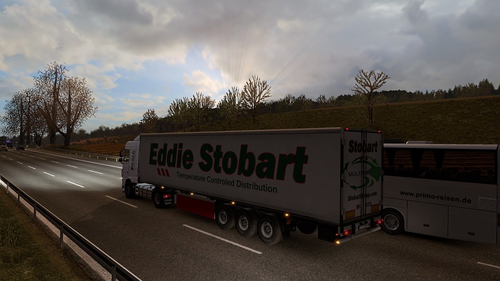 Die nächste Fracht war ein Kühltrailer von Stobart. Hatte man auch nicht so oft dran. Bei schönstem Wetter schaffte ich es noch bis an die Grenze zu den Niederlanden und ließ mich auch nicht von untermotorisierten Reisebussen aufhalten, die den eher leichten Anstieg mit unter 60 in Angriff nahmen.