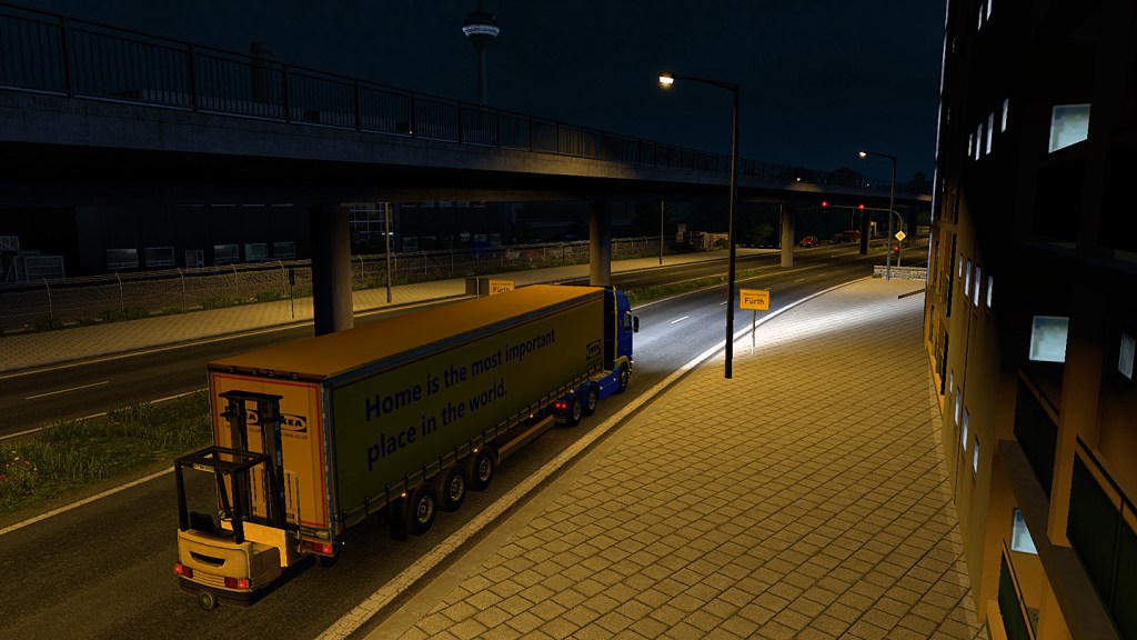 Streng genommen war es noch Montag, als ich kurz nach 23 Uhr in Fürth bei Ikea mit einem Trailer voll Transport-Racks für Möbel und mit einem Mitnahmestapler los fuhr. Der sollte zurück nach Amsterdam, damit wurden Ausstellungsregale, Trennwände, die Infostände und ähnliches Zeug zu neu gebauten oder umgebauten Möbelhäusern transportiert.