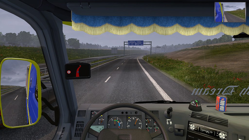 Ich musste mich also auf Smalltalk mit Judith und André, eine Tasse Tee aus Julians Bestand und ein Stück von dem gemischten Kuchenteller mit den Resten der Geburtstagsfeier von Andrés Mutter, der zur allgemeinen Verfügung in der Küche stand, beschränken. Und so dauerte es nicht lange, bis ich wieder auf das auch schon leicht angestaubte Armaturenbrett schaute. Vor allem der psychedelische Drehzahlmesser mit so vielen Farben war ein echter Blickfang mit dem Charme der frühen 90er. Offensichtlich hatte Volvo diesen Designer danach gefeuert und er war bei DAF untergekommen, denn der Drehzahlmesser im XF106 hatte noch 25 Jahre später ein ähnlich schräges Farbschema.
