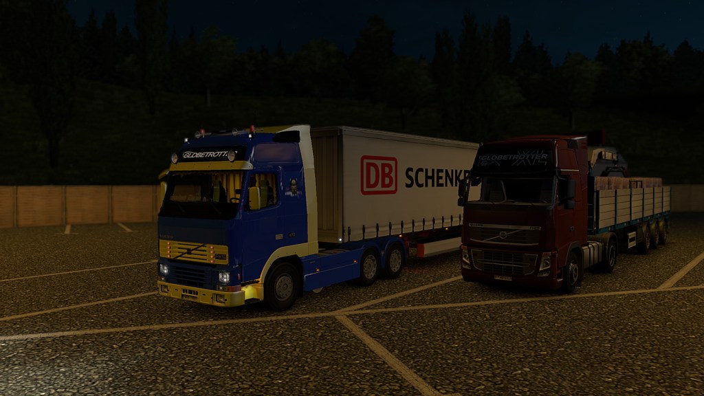 Unsere Truppe war wieder ziemlich groß. Aus Deeside waren Alex und Timo mit ihren DAF XF105, Shawn mit dem Scania R490, Luke ohne LKW und ich mit dem FH16 da. Bochum war mit Lennart und seinem Scania R500, Maxim mit seinem Stralis Hi-Way, Jan mit dem Actros 2558 und Sebastian leihweise mit Julians FH16 vertreten – damit könnte er vorübergehend zu den 10 bestmotorisierten Erstlehrjahr-Azubis in Deutschland gehören. Außerdem waren aus Neuss ein Neuer namens Matthias mit einem der ehemaligen Schütz-TGX und Maxi mit dem TGX Brückenzug da. Aus Perchtoldsdorf hatten wir die Actros-Fraktion mit Felix, Kilian, Ilarion und Maxis Counterpart David hier, die beiden Brückenfahrer hatten auch Ladung und heute Morgen noch schnell umgebrückt. Petr, der tschechische Kumpel von Felix, fuhr jetzt einen TGX Euro 6 und hatte für seinen EEV auch einen Fahrer namens Jan eingestellt, weshalb wir aufpassen mussten, wenn wir diesen Namen riefen, dass wir keine zwei Antworten bekamen.