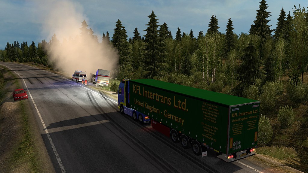 Und dann merkten wir, warum die Dashcams so wichtig waren. Ich fuhr hinter einem LKW, uns kam einer der unvermeidlichen und meistens hoffnungslos untermotorisierten GAZelle Kleintransporter entgegen, den dann ein mindestens mal 160 Sachen schneller Skoda Fabia überholte. Als er merkte, dass sein Versuch, 30 Sekunden einzusparen frontal auf einen Renault Magnum zuführte, war es zu spät und es gab vor uns einen großen Knall. Ich ging in die Eisen und setzte den Warnblinker, auch Dima zog zur Seite, als der auf der Fahrerseite komplett zerstörte Skoda schon im Graben lag und in Flammen stand.