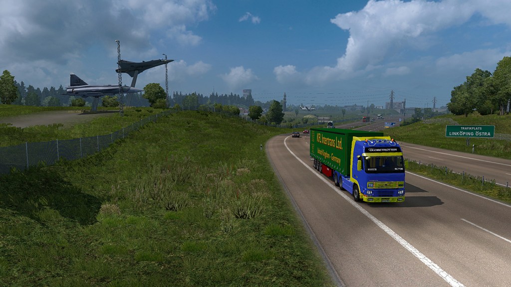 Statt der Transponder brachte ich jetzt die spätestens in Russland sowieso unvermeidliche Dashcam an. Bei Linköping konnte die gleich festhalten, wie uns ein ziemlich ambitionierter Viehtransport überholte. Dima jedoch entdeckte was anderes, wo wir vor einem halben Jahr in tiefster Nacht vorbeigefahren waren und fragte über Funk: „Warum sind hier eigentlich rund um die Stadt lauter Flugzeuge aufgeständert?“ „Hier sind die Saab-Flugzeugwerke. Das sind die Meilensteine aus deren Firmengeschichte.“