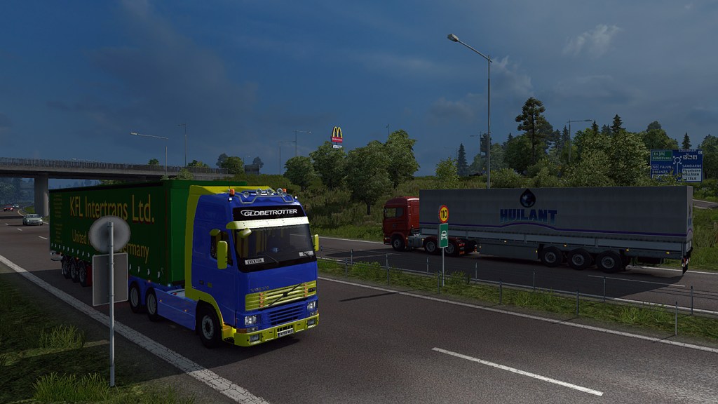 Ich hatte einen unserer Ackermann-Trailer mit Hubbühne dran und fuhr unseren neuen alten Volvo. Dima hatte ernsthaft einen der letzten Foden 4000 vor der Umstellung auf DAF CF und einen Trailer mit Moffettstapler bei einem russischstämmigen Unternehmen aus Southampton geliehen. Dazu kam noch unsere Leyland 75 Hofschleuder. Wenn man die modernen Autos auf den PKW-Plätzen nicht im Blickfeld hatte, sah es hier gerade aus wie in den 90ern. Wenigstens Timos Ford Sapphire und Rafals 97er Honda Civic Coupé störten den Eindruck nicht. Bens W203 C-Klasse war auch nur ein Bisschen zu modern.
