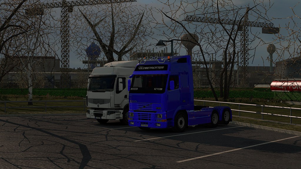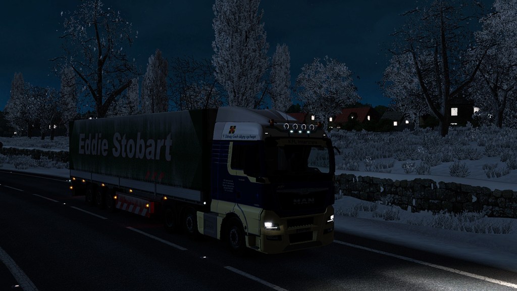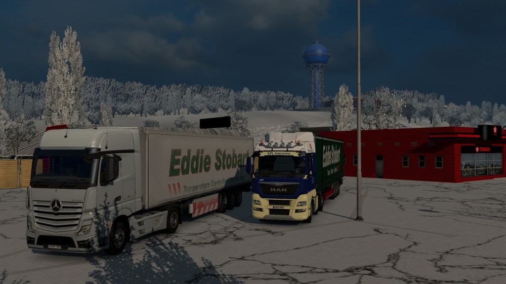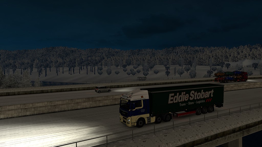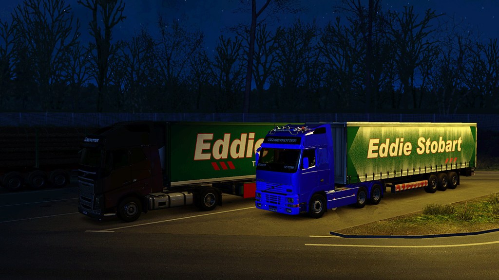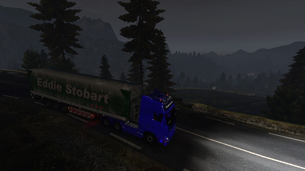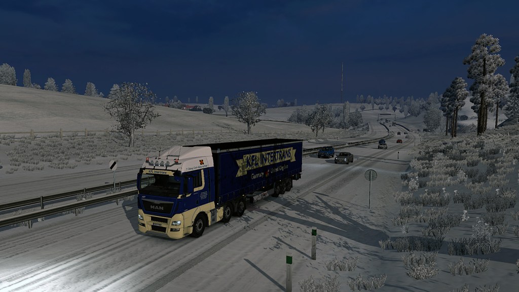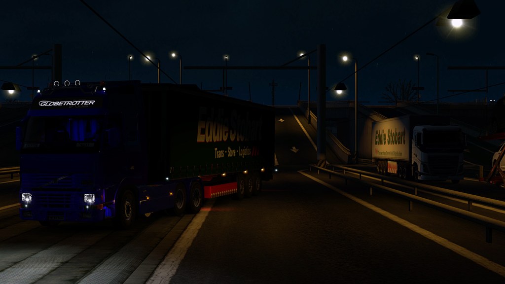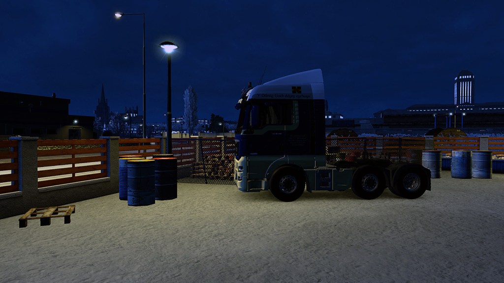 In den letzten Wochen vor Weihnachten ging der Ernst des Lebens dann auch für mich mal wieder los. Dadurch, dass wir 3 Fahrzeuge abgeordnet hatten an Stobart, konnten Philip und Lewis das Büro problemlos alleine schmeißen und ich nahm mir also den alten Volvo FH16, dem Luke ein Metallicblau mit einem fast schon selbstleuchtend wirkenden Effektlack spendiert hatte, ein Effekt, der besonders bei wenig Umgebungslicht zur Geltung kam (nein, es waren wohl die Materialdateien dieses Trucks – der Ur-FH war nicht die glücklichste Mod-Wahl meiner ETS2-Karriere).