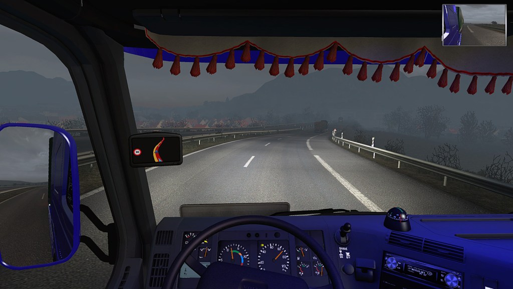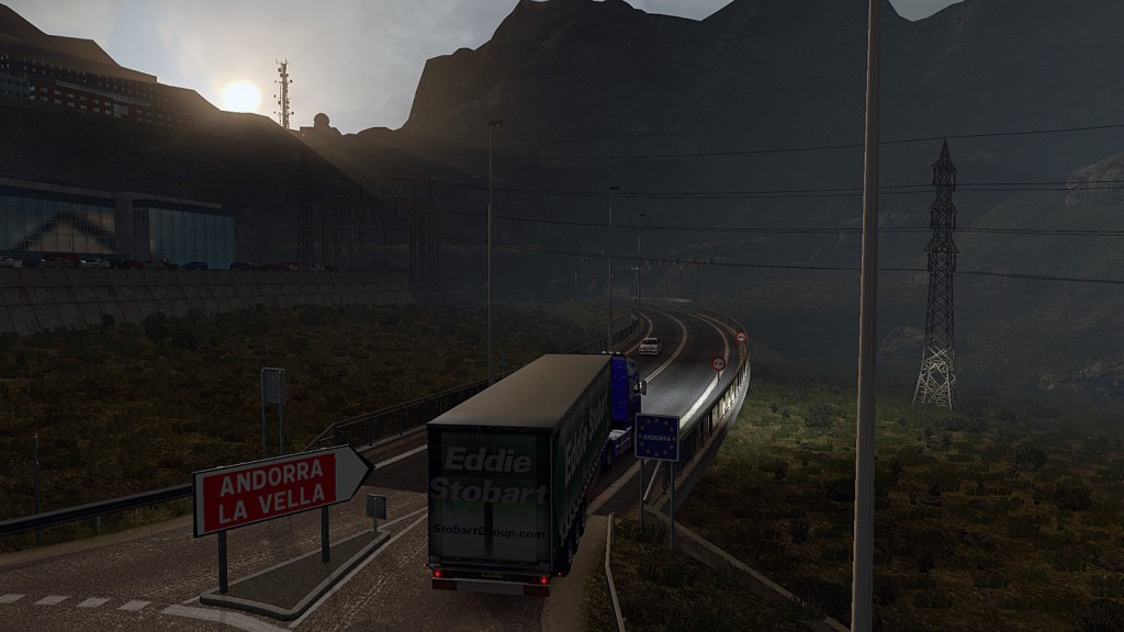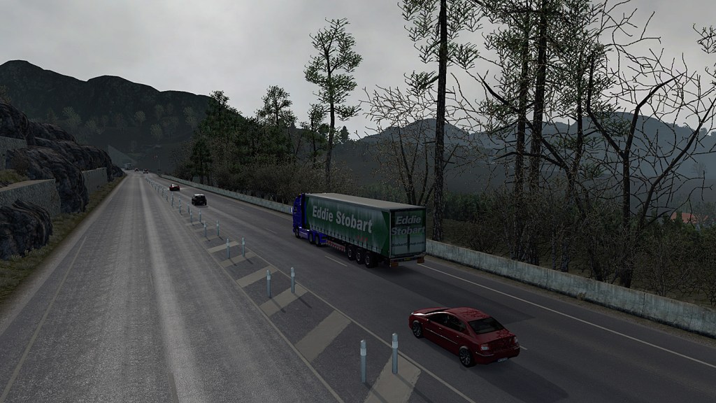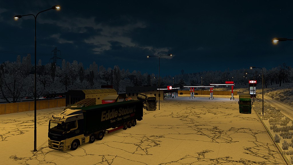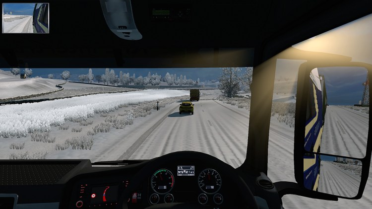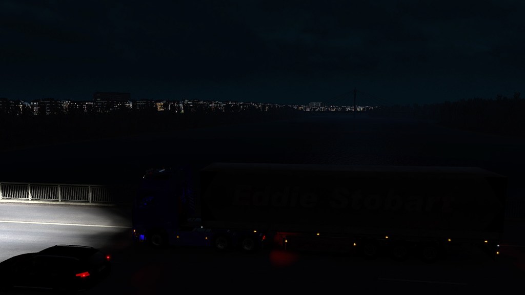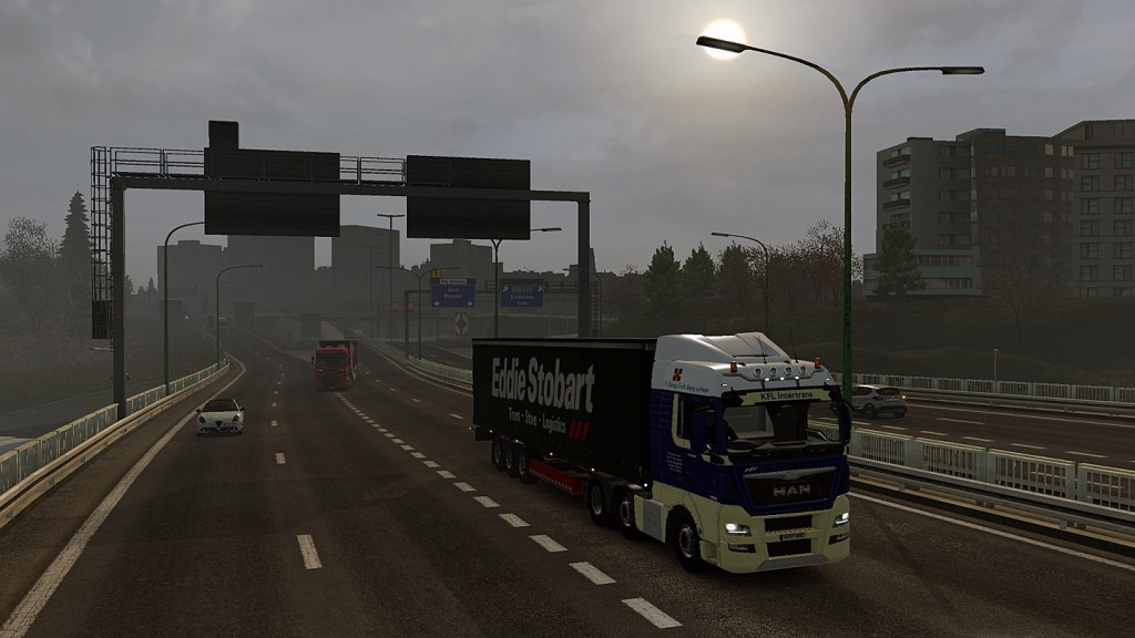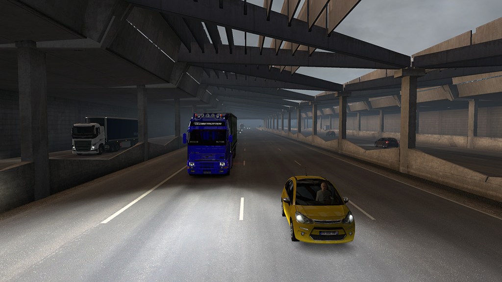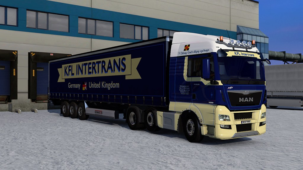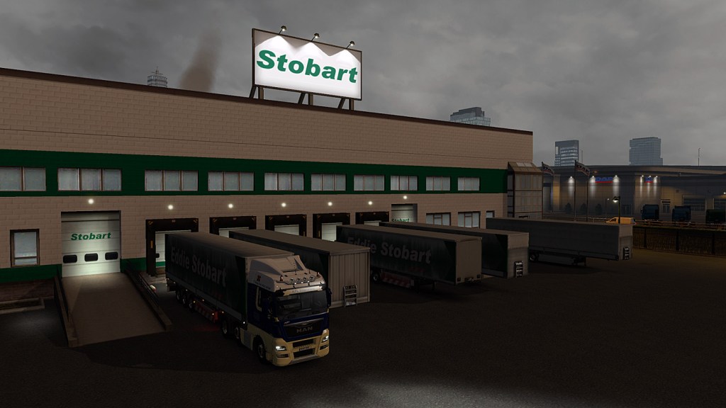 In den letzten Wochen vor Weihnachten ging der Ernst des Lebens dann auch für mich mal wieder los. Dadurch, dass wir 3 Fahrzeuge abgeordnet hatten an Stobart, konnten Philip und Lewis das Büro problemlos alleine schmeißen und ich nahm mir also den alten Volvo FH16, dem Luke ein Metallicblau mit einem fast schon selbstleuchtend wirkenden Effektlack spendiert hatte, ein Effekt, der besonders bei wenig Umgebungslicht zur Geltung kam (nein, es waren wohl die Materialdateien dieses Trucks – der Ur-FH war nicht die glücklichste Mod-Wahl meiner ETS2-Karriere).
