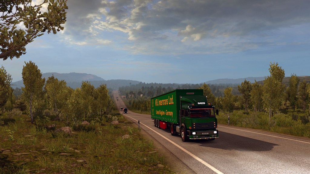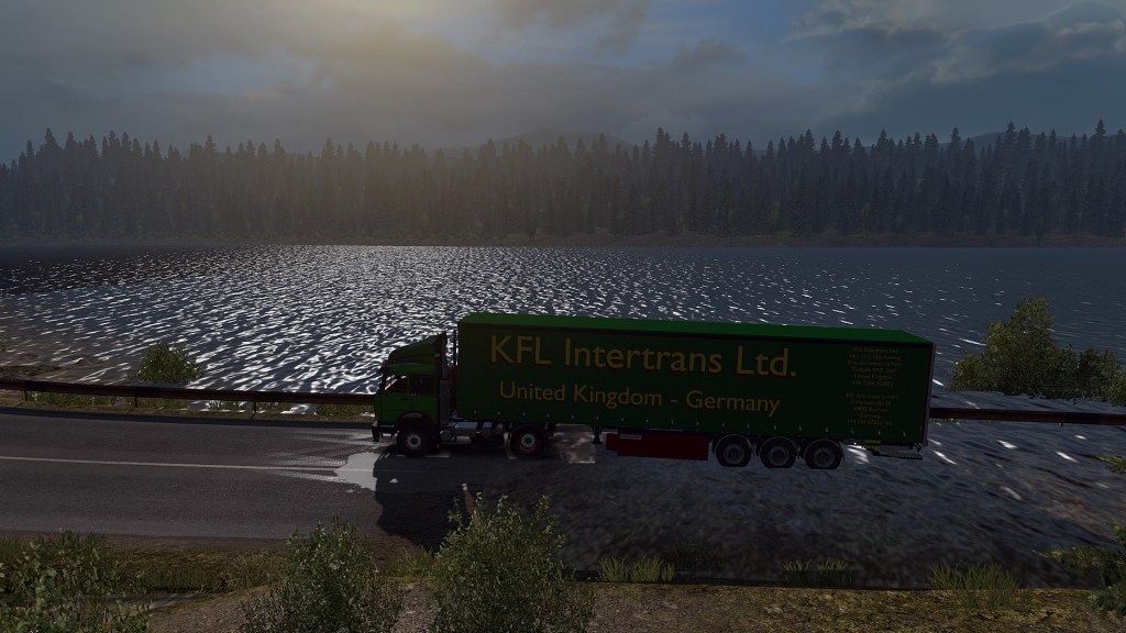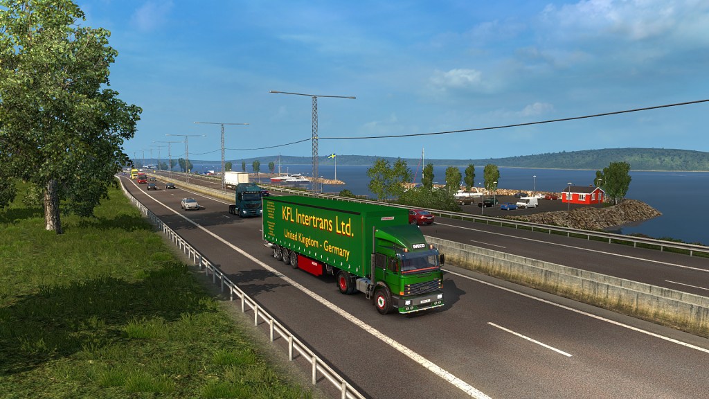 Auf dieser Tour konnten wir uns abwechseln, weil Dimas Truck mit 97 km/h bzw. 60 mph abgeregelt war, meiner sogar offen. Und mit 425 bhp (431 DIN-PS) aus dem 11 Liter Cummins M11 würde mir Dima schon nicht entkommen. Dieses Motörchen war sogar bei meinem Einstieg bei BP mit 450 bhp im ERF EC11 ziemlich asthmatisch geraten. Also fuhr nun er vor, bei Sonnenschein am Vetternsee vorbei.